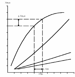 Зависимость выходной величины от входной величины в установившемся режиме называется статической характеристикой ОР. Статические характеристики могут быть как линейными, с различными коэффициентами наклона, так и нелинейными, при чем большинство реальных объектов в целом имеют нелинейные.