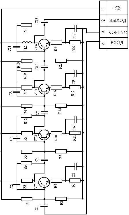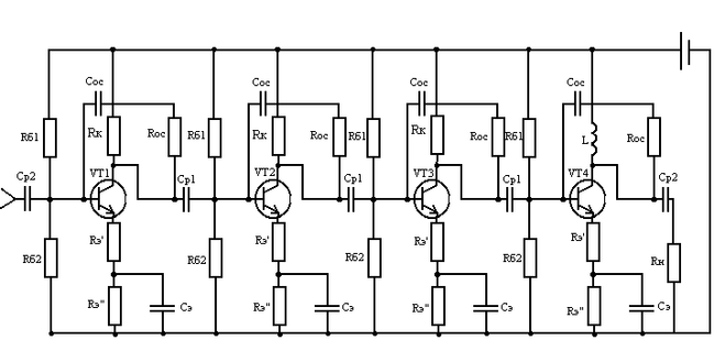Р исунок 4.1.1- Усилитель приёмного блока широкополосного локатора на четырёх каскадах.