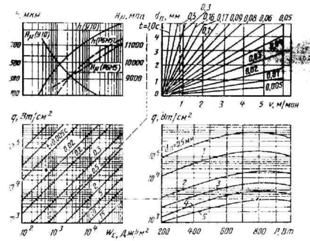 Для выбора режимов упрочнения импульсным излучением можно пользоваться номограммами, построенными на основании экспериментальных иcследований.