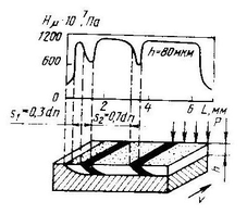 Наиболее распространенная схема обработки — однодорожечное упрочнение. В зависимости от траектории перемещения луча или закона перемещения заготовки конфигурация упрочненного участка поверхности может иметь различный вид. Производительность П обработки зависит от скорости v относительного переменность П обработки зависит от скорости v относительного перемещения луча и поверхности, а также от ширины зоны В: П = vB- если же параллельно наносится несколько дорожек упрочнения, то производительность также зависит от их числа и коэффициента перекрытия или шага обработки. Из рис видно, как изменяется микротвердость но длине L обрабатываемой зоны в зависимости от степени перекрытия (шага s) дорожек упрочнения. Как и при импульсной обработке, в перекрытых зонах наблюдается существенное снижение ;твердости в результате .