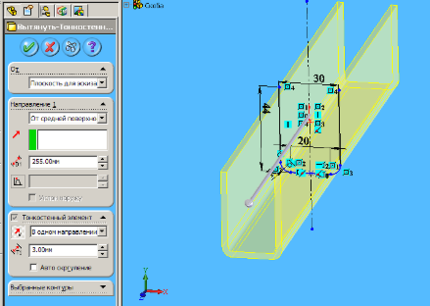 Используя кнопки «Линия», «Автоматическое нанесение размеров», «Скругление» панели инструментов «Эскиз», рисуем профиль кронштейна, как показано на рис. 3.1. Затем, используя инструмент «Вытянутая бобышка/основание» панели инструментов «Элементы», вытягиваем нарисованный эскиз на 255 мм, используя при этом опцию «Тонкостенный элемент», как показано на рис. 3.2.