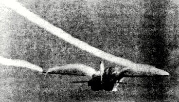 Fig 15 Condensation showing the distribution of lift along a wing. The wingtip vortices are also seen. (from Patterns in the Sky, J.F. Campbell and J.R. Chambers, NASA SP-514.)