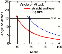 The increase in the angle of attack with increased load has a downside other than just the need for more power. As shown in figure 9 a wing will eventually stall when the air can no longer follow the upper surface, that is, when the critical angle is reached. Figure 14 shows the angle of attack as a function of airspeed for a fixed load and for a 2-g turn. The angle of attack at which the plane stalls is constant and is not a function of wing loading. The stall speed increases as the square root of the load. Thus, increasing the load in a 2-g turn increases the speed at which the wing will stall by 40%. An increase in altitude will further increase the angle of attack in a 2-g turn. This is why pilots practice "accelerated stalls" which illustrate that an airplane can stall at any speed. For any speed there is a load that will induce a stall.