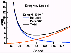 At cruise, a non-negligible amount of the drag of a modern wing is induced drag. Parasitic drag, which dominates at cruise, of a Boeing 747 wing is only equivalent to that of a 1/2-inch cable of the same length. One might ask what affects the efficiency of a wing. We saw that the induced power of a wing is proportional to the vertical velocity of the air. If the length of a wing were to be doubled, the size of our scoop would also double, diverting twice as much air. So, for the same lift the vertical velocity (and thus the angle of attack) would have to be halved. Since the induced power is proportional to the vertical velocity of the air, it too is reduced by half. Thus, the lifting efficiency of a wing is proportional to one over the length of the wing. The longer the wing the less induced power required to produce the same lift, though this is achieved with an increase in parasitic drag. Low speed airplanes are affected more by induced drag than fast airplanes and so have longer wings. That is why sailplanes, which fly at low speeds, have such long wings. High-speed fighters, on the other hand, feel the effects of parasitic drag more than our low speed trainers. Therefore, fast airplanes have shorter wings to lower parasite drag.