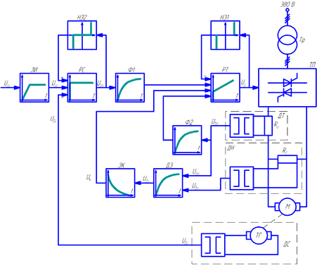 Нелинейные элементы НЭ1 и НЭ2 предназначены для ограничения координат системы. Элемент НЭ1 ограничивает выходной сигнал регулятора тока, а следовательно, напряжение управления преобразователя и его выходную ЭДС. Элемент НЭ2 ограничивает выходной сигнал регулятора скорости, тем самым ограничивается сигнал задания тока и сам ток якоря.