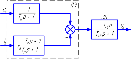 Компенсирующий сигнал Uк подается на вход регулятора тока, а не не-посредственно в точку действия ЭДС якоря (между звеньями ТП и ГЦ). Поэтому влияние звеньев регулятора тока и преобразователя на прохождение компенсирующего сигнала необходимо устранить. Это достигается за счет включения в цепь обратной связи по ЭДС звена компенсации. Передаточная функция звена компенсации определяется по формуле