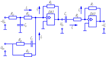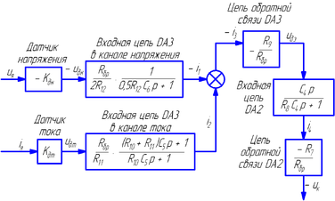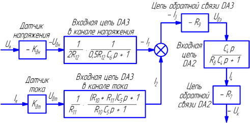 Принципиальная схема датчика ЭДС и звена компенсации показана на рис. 13. Фильтр в канале напряжения реализуется на элементах R12, R13, С6. Форсирующее звено в канале тока реализуется на элементах R10, R11, С5. Операционный усилитель DA3 предназначен для суммирования сигналов в датчике ЭДС, что осуществляется путем суммирования токов I1 и I2. Звено компенсации выполнено на операционном усилителе DA2. Элементы входной цепи и цепи обратной связи усилителя DA2 R8, R7, С4 обеспечивают реализацию свойств реального дифференцирующего звена.