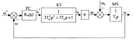 Расчет параметров математической модели контура скорости. Рассмотрим структуру и выполним расчет параметров модели контура скорости, используя систему относительных единиц. Структурная схема контура регулирования скорости представлена на рис.19. Контур регулирования тока якоря при его настройке на модульный оптимум рассматриваем как одно звено с передаточной функцией (10). Контур скорости включает в себя звено регулятора скорости (PC), звено контура тока якоря (КТ), звено умножения на поток и звено механической части привода (МЧ). Обратная связь по скорости при рассмотрении относительных величин принимается единичной. На объект управления действует возмущающее воздействие — момент статического сопротивления, создаваемый нагрузкой на валу двигателя.