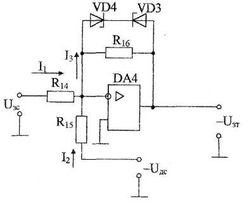Принципиальная схема регулирующей части контура скорости представлена на рис.20. Регулятор скорости выполнен на операционном усилителе DA4. Суммирование сигнала задания на скорость и сигналаобратной связи по скорости осуществляется путем суммирования токов I1 и I2. Включение в цепь обратной связи усилителя DA4 сопротивления R16 обеспечивает пропорциональный тип регулятора. Стабилитроны VD3, VD4 реализуют нелинейный элемент НЭ2.