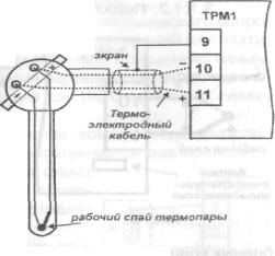Підключення термопар до приладу повинне проводитися за допомогою спеціальних компенсаційних (термоелектродних) проводів, виготовлених з тих же самих матеріалів, що і термопара (див. рис. 13). Допускається також використовувати дроти з металів з термоелектричними характеристиками, які в діапазоні температур 0...100°С аналогічні характеристикам матеріалів електродів термопари. При з'єднанні компенсаційних проводів з термопарою і приладом необхідно дотримувати полярність. При порушенні вказаних умов можуть мати місце значні погрішності при вимірюванні.