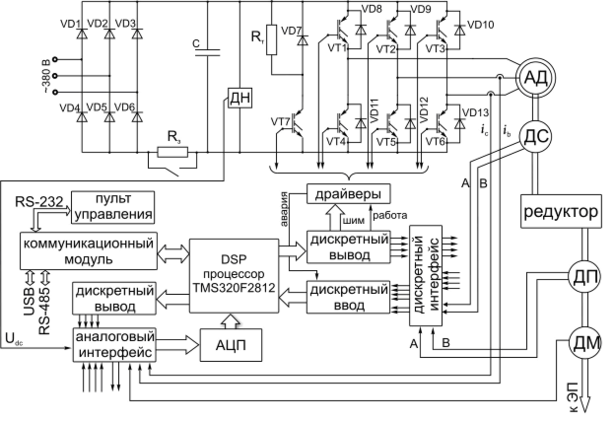 На рисунке 14 представлена аппаратная реализация моментного асинхронного ЭП для создания усилий, имитирующих работу подъемных механизмов. Необходимый набор защитных функций, система векторного управления и формирователь моментных усилий реализованы программно на базе ресурсов микропроцессора.
