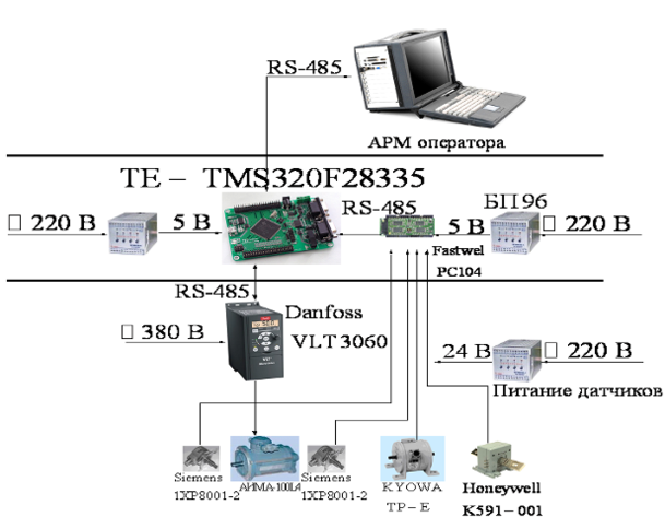 2. Средний уровень – реализация обработки информации от измерительной системы нижнего уровня и формирование управляющего сигнала для исполнительного привода (в том числе исполнительных элементов автоматики) согласно выбранному алгоритму управления. Для реализации перечисленных функций был выбран Модуль TE- TMS320F28335 на базе микроконтроллера Delfino от Texas Instruments.