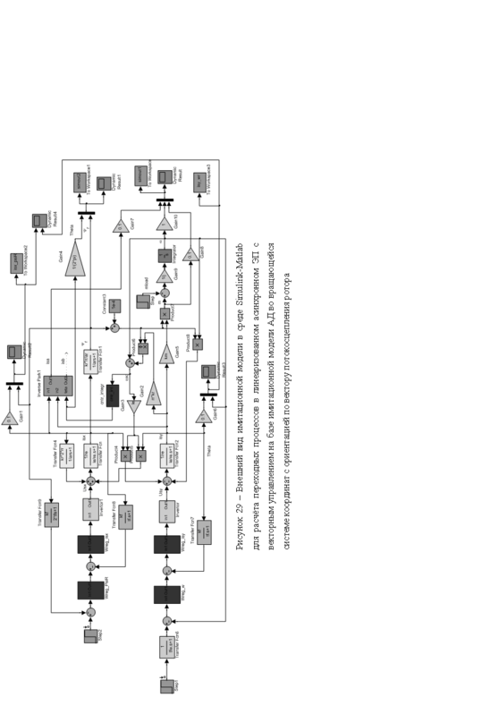 Исследование показателей качества имитационной модели ЭП в представленном виде позволяет проверить работоспособность и оценить взаимное влияние перекрёстных контуров управления потокосцеплением ротора и скорости. Используя программную среду Simulink-Matlab на базе структурной схемы рисунка 28 разработаем имитационную модель линеаризованного асинхронного ЭП с векторным управлением. На рисунке 29 представлен внешний вид имитационной модели в среде Simulink-Matlab для расчёта переходных процессов.