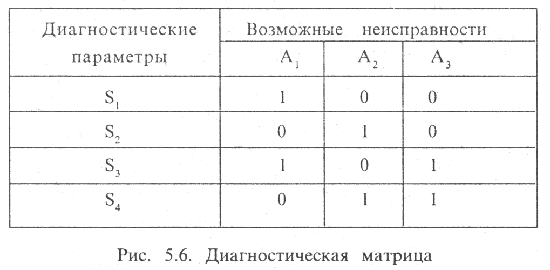 Единица в месте пересечения строки и столбца означает возможность существования неисправности, а ноль — отсутствие такой возможности. С помощью представленной на рисунке диагностической матрицы решается задача локализации одной из трех возможных неисправностей объекта с помощью четырех диагностических параметров. Физический смысл решения задачи заключается в определении соответствия полученной комбинации диагностических параметров, вышедших за норматив, существованию одной из неисправностей. Так, в рассматриваемом примере имеем: неисправность А, возникает в случае одновременного выхода за норматив параметров S, и S3, неисправность А2 — параметров S, и S4, и неисправность А3 — параметров S3 и S . Диагностические матрицы являются основой автоматизированных логических устройств, применяемых в современных средствах технического диагностирования.