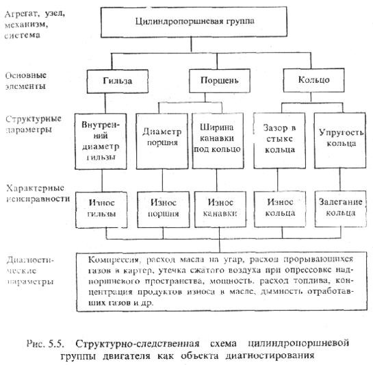 Поэтому при решении задачи выбора диагностических параметров в сложных ситуациях сначала определяют возможный набор параметров. Для этого применяют построение так называемой структурно-следственной схемы узла или механизма, представляющей собой граф-модель, увязывающую в единое целое основные элементы механизма, характеризующие их структурные параметры, перечень характерных неисправностей, подлежащих выявлению, и набор возможных для использования диагностических параметров. Перечень характерных неисправностей механизма составляют на основе статистических оценок показателей его надежности. Пример структурно-следственной схемы цилиндропоршневой группы двигателя приведен на рис. 5.5.