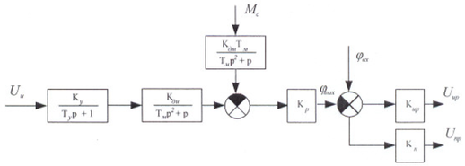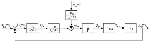 Так как индукция якоря учтена в постоянной времени усилителя мощности, то в (10) индукция равна нулю. Отсюда можно найти ток якоря: