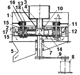 ЦЕНТРОБЕЖНО-УДАРНАЯ ДРОБИЛКА /3/. Изобретение относится к дроблению твердых материалов и обеспечивает повышение надежности дробилки. Дробилка содержит корпус 1 с отражательными поверхностями 2, вертикальный приводной вал 7 с ротором 10, имеющим разгонные каналы 14 и установленные на осях 16 ролики-ускорители 17. В верхней части корпуса 1 установлена цилиндрическая обечайка 6, а на осях 16 закреплены ролики-сателлиты 18, контактирующие с внутренней поверхностью цилиндрической обечайки 6. Дробилка имеет загрузочный бункер 3, питающую трубу 4 и разгрузочное отверстие 5. Ротор 10 выполнен из верхнего 11 и нижнего 12 дисков и имеет загрузочное отверстие 13.
