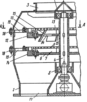 Соосно в корпусе 1 установлен лопастной ротор из отдельных лопастей 9 в виде металлических пластин постоянной толщины и ширины, жестко прикрепленных (например, сваркой) на втулке к цилиндрической ее поверхности и под углом а - 50...60° к плоскости вращения. Втулка крепится на валу 10 ротора шпонкой. Количество лопастей целесообразно применять от трех до шести в зависимости от диаметра корпуса и крупности исходного продукта. Вал 10 ротора посредством муфты или редуктора 11 соединен с приводом 12 и вращается в упорных подшипниках 13 и 14, расположенных соответственно в верхней и нижней частях устройства. Причем нижний упорный подшипник 14 установлен в подпятнике на раме 15 и прикрыт крышкой 16, жестко закрепленной на валу 10.
