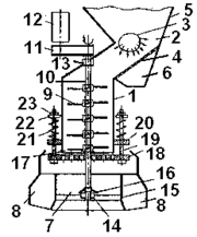 За лопастным ротором с зазором 17 установлена колосниковая решетка 18. Она снабжена направляющими 19, которые пропущены через кронштейны 20 и не допускают ее вращательного движения, позволяют фиксировать и перемещать решетку 18 в осевом направлении посредством механизма регулирования : пружины 21, шайбы 22 и гайки 23, регулируя тем величину кольцевого зазора 17. Эта величина устанавливается такой, при которой получают дробленый продукт заданной крупности, т.е. соблюдается условие прохождения материала через отверстия решетки 18 без переизмельчения.
