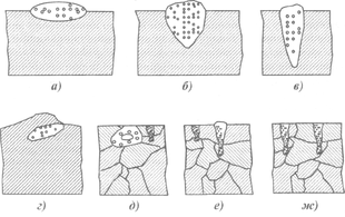Рисунок 1 - Виды коррозии: а - пятнами; б - язвенная; в - точечная; г -подповерхностная; д - структурно-избирательная; е -межкристаллитная; ж -коррозионное растрескивание