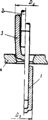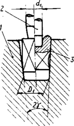 Задавка. Исходной заготовкой для горячей штамповки корпусов типа «стакан» является квадратная штанга со скругленными ребрами. Большая величина допуска на изготовление штанги и косина торца исходной заготовки после ломки не обеспечивают качественного выполнения операции прошивки. Для обеспечения надежного направления прошивному пуансону и для устранения косины торца исходной заготовки вводится операция (или переход) задавки. Схема задавки приведена на рис. Исходная заготовка 3 устанавливается в прошивной матрице . Операцию задавки осуществляет задавочный пуансон 2. В результате этой операции оформляется конус на наружной поверхности заготовки, по которому она центрируется в прошивной матрице, а на торцевой поверхности образуется углубление от задавочного пуансона.