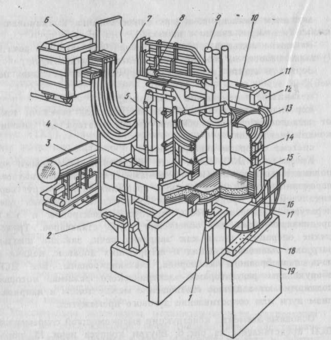 Рис. 1. 1 – механизм наклона печи; 2 – фиксатор; 3 – насосно-аккумуляторная станция; 4 – механизм поворота портала; 5 – механизм перемещения электродов; 6 – печной трансформатор; 7 – вторичный токоподвод; 8 – электрододержатель; 9 – графитированный электрод; 10 – свод водоохлаждаемый; 11 – механизм подъема свода; 12 – полупортал; 13 – патрубок газоотсоса сводовый; 14 – стеновые водоохлаждаемые панели; 15 – корпус печи; 16 – люлька; 17 – сливной носок; 18 – фундаментная балка; 19 – фундамент.
