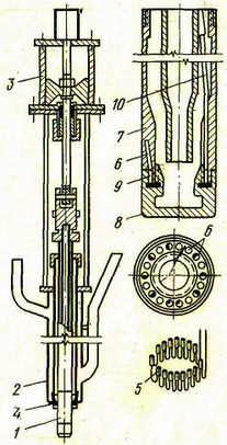 Шомпол 1 охлаждается водой, поступающей к его штецерам по гибким шлангам. Чувствительным элементом шомпола служит дифференциальная батарея миниатюрных хромель-алюмелевых термопар 5, горячие и холодные спаи которых расположены на разных расстояниях от наружной поверхности шомпола в глухих концах соответственно наклонных и прямых отверстий 6, высверленных с торца термоцилиндра 7 по всей его окружности. Таким образом, термобатарея фиксирует температурный перепад по толщине цилиндрической стенки термоцилиндра между заданными ее сечениями. Этот перепад температуры ∆t определяется удельным тепловым потоком, проходящим через стенку теплоприемника, который в свою очередь связан с величиной падающего теплового потока. Торец термоцилиндра 7 закрыт медным наконечником 8, наружный буртик которого защищает кольцевой паз 9, соединяющий все отверстия 6 с трубками 10, служащими для вывода концов термобатареи.