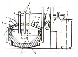 Рис. 8. Основные элементы комплекса ДСП: 1 - свод; 2 - рабочее окно; 3 - сталевыпускное отверстие; 4 - электроды; 5 - электрододержатели; 6 -короткая сеть; 7 - трансформатор; 8 - кислородная фурма; 9 - отвод отходящих газов; 10 - загрузочная воронка; 11 – шомпольный термозонд.