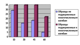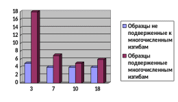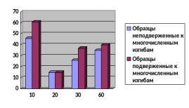 Ниже представлены диаграммы, построенные по данным таблицы 2 и 3. В следующих диаграммах очень четко видно как влияют многочисленные изгибы на прочность бумаги.