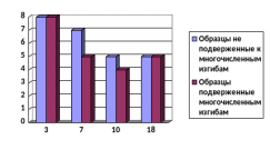 После чего образцы были подвержены определенному числу изгибам, они были проверены вновь на прочность волокон. Результаты представлены в следующей таблице.