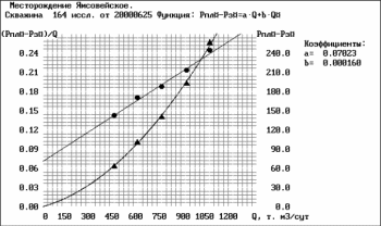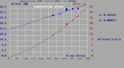 По результатам проведённого исследования определяют Рпл, Рзаб и Q. Рассчитываются значения P2 = Р2пл - Р2заб на различных режимах работы скважины. После этого строится зависимость между P2 и Q (рис.3.1). Полученная индикаторная кривая проходит через начало координат. Обработка индикаторной кривой в координатах P2 /Q от Q позволяет определить из графика значения коэффициентов а и b. При этом коэффициент а определяется как отрезок, отсекающий на оси P2 /Q величину а = 0,07023, а коэффициент b, как тангенс угла наклона прямой к оси, равный b = 0,000160.