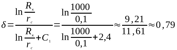 и коэффициент совершенства гидродинамически несовершенной по степени вскрытия скважины радиусом rс = 0,1 м, находящейся в пласте с круговым контуром питания. Мощность пласта h = 16 м, мощность вскрытой части пласт b = 9,6 м, радиус контура питания Rк = 1 км.