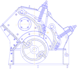Корпус дробилки состоит из станины, верхних неподвижной и откидывающейся частей. В верхней неподвижной части закреплены приемный лоток и первая отражательная плита. Откидывающаяся часть соединена с неподвижной частью корпуса и станиной легкоразъемными струбцинами или откидными болтами. Корпус раскрывается винтовым домкратом, приводимым в действие вручную или с помощью электропривода. Такое решение позволило значительно упростить операцию раскрытия дробилки для профилактического обслуживания.