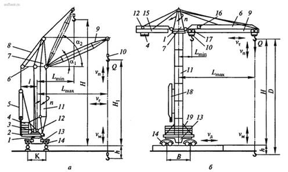 К основным параметрам кранов относятся (см. рис): вылет L - расстояние по горизонтали от оси вращения поворотной части крана до вертикальной оси крюковой подвески; грузоподъемность Q - наибольшая допустимая для соответствующего вылета масса груза, на подъем которого рассчитан кран; грузовой момент М - произведение грузоподъемности Q на соответствующий вылет L (часто используется в качестве главного обобщающего параметра крана); высота подъема Н и глубина опускания h - соответственно расстояние по вертикали от уровня стоянки крана (головки рельса для рельсовых кранов, нижней опоры самоподъемного крана, пути перемещения пневмоколесных и гусеничных кранов) до центра зева крюка, находящегося в верхнем или нижнем крайнем рабочем положении; диапазон подъема D - сумма высоты подъема H и глубины опускания h; колея К - расстояние между продольными осями, проходящими через середину опорных поверхностей ходового устройства крана, измеряемое по осям рельсов у рельсовых кранов и по продольным осям пневмоколес или гусениц у автомобильных, пневмоколесных и гусеничных кранов; база В - расстояние между вертикальными осями передних и задних колес (у пневмоколесных и автомобильных кранов), ведущими и ведомыми звездочками гусениц (у гусеничных кранов) или ходовых тележек, установленных на одном рельсе (у рельсовых кранов); задний габарит l - наибольший радиус поворотной части (поворотной платформы или противовесной консоли) со стороны, противоположной стреле; vп - скорость подъема и опускания груза, равного максимальной грузоподъемности крана (при установке на кране многоскоростных лебедок указываются все скорости и массы грузов, соответствующие каждой скорости подъема и опускания); скорость посадки груза vM - наименьшая скорость плавной посадки груза при его наводке и монтаже; частота вращения n поворотной части крана при максимальном вылете с грузом на крюке; скорость передвижения крана vд - рабочая скорость передвижения с грузом по горизонтальному пути; скорость передвижения грузовой тележки vт с наибольшим рабочим грузом по балочной стреле; скорость изменения вылета vг стрелы (у кранов с подъемной стрелой) от наибольшего до наименьшего; установленная мощность Ру (суммарная мощность одновременно включаемых механизмов крана); наименьший радиус закругления R оси внутреннего рельса на криволинейном участке подкранового пути; радиус поворота Rп - наименьший радиус окружности, описываемой внешним передним колесом автомобильных или пневмоколесных кранов при изменении направления движения; конструктивная масса тк - масса крана без балласта, противовеса и съемных устройств в не заправленном состоянии; общая (полная) масса крана тo в рабочем состоянии; нагрузка на колесо Fк - наибольшая вертикальная нагрузка на ходовое колесо при работе крана в наиболее неблагоприятном его положении; допустимая скорость ветра vв на высоте 10 м от земли для рабочего и нерабочего состояний, при которой кран сохраняет прочность и устойчивость в процессе эксплуатации.
