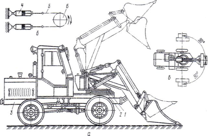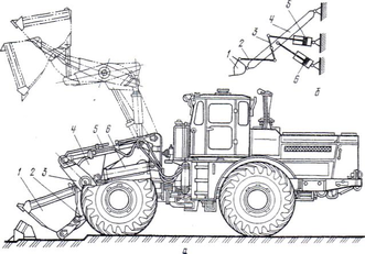 По типу ходового устройства они могут быть пневмоколесными и гусеничными. Первые имеют большие транспортные скорости, не разрушают поверхности дорог и площадок складов. Вторые позволяют развивать в 1,2...1,5 раза большее, чем у колесных, усилие при внедрении в грунт силой тяги, а также обладают большой маневренностью вследствие возможности разворота на месте, что сокращает продолжительность цикла на 8...25% и повышает производительность на 20...30%. В качестве базовых машин для погрузчиков применяют специальные пневмоколесные шасси, промышленные тракторы погрузочных модификаций или тракторы общего назначения обеспечивает разгрузку ковша со стороны разрабатываемого материала. Он состоит из пневмоколесного трактора с шарнирно сочлененной рамой и ковша 1, укрепленного на стреле 4 и управляемого рычажными механизмами 2,3 с помощью гидроцилиндров 5 двухстороннего действия. Стрелу поднимают и опускают двумя гидроцилиндрами 6. Рычажная система обеспечивает постоянное положение заполненного ковша при его подъеме, что исключает потери загруженного материала.