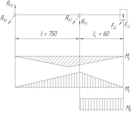 Ry5= Fr4 (l + l4)/l = 1622·810/750 = 1752 H;