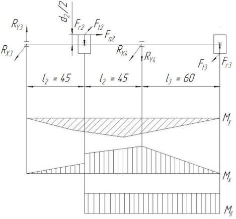 Rx3 = (Ft3l3 + Ft2l2)/(2l2) =(1225·60 + 1867·45)/(2·45) = 1750 Н;