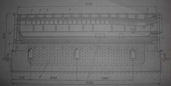 Основными элементами отражательной печи (рисунок 1) являются: фундамент, под, стены и свод, которые в совокупности образуют рабочее пространство печи; устройства для подачи шихты, выпуска продуктов плавки и сжигания топлива; система отвода дымовых и технологических газов, боров и дымовая труба. Фундамент печи представляет собой массивную бетонную плиту толщиной 2,5–4 м, верхняя часть которой выполнена из жаропрочного бетона. В фундаменте обычно имеются вентиляционные каналы и смотровые проходы. Рабочее пространство является основной частью печи, так как в нем протекает технологический процесс и развиваются высокие температуры (1500–1650 °С). Подина (лещадь) выполняется в виде обратного свода, толщиной 1,0–1,5 м. Для кислых шлаков в качестве огнеупорных материалов при кладке пода и стен печи используют динас, для основных шлаков – хромомагнезит. Толщина стен на уровне ванны 1,0–1,5 м, над ванной –0,5–0,6 м. Для теплоизоляции стен обычно используют легковесный шамот. Расстояние между боковыми стенами (ширина печи) в зависимости от конструкции агрегата изменяется в пределах 7–11 м, между торцевыми стенами (длина печи) 28–40 м.