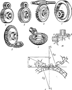 Этот недостаток отсутствует в шевронных передачах, у которых каждое из колес представляет собой два совмещенных в одной детали косозубых колеса со встречными углами наклона зубьев, так что осевые усилия, возникающие в обеих половинах шевронного колеса, направлены в противоположные стороны и взаимно уравновешиваются. Однако изготовление шевронных колес весьма трудоемкое, поэтому они применяются главным образом для передачи очень больших мощностей при ударных нагрузках.