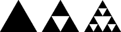 Число треугольных пар все меньшего и меньшего масштаба в нем бесконечно. Число черных треугольников в этом построении растет как 3n, где n — номер шага, а длина их стороны уменьшается как 2–n. Легко показать, что площадь белых пятен равна площади исходного треугольника.