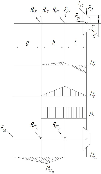 Му = RDX(e+f) – Fr2e - Fa2d2/2 = 2003 · 0,1745 – 4066 · 0,114 – 434 · 0,09= -153,1 Н·м;
