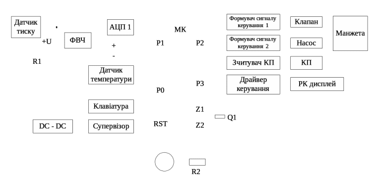 Пристрій складається з мікроконтролера МК, блоку вимірювання тиску, датчика температури, клавіатури, картки пам’яті, РК дисплею та блоку живлення.