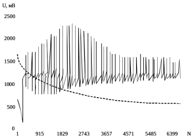 Рисунок 2.2 – Тиск в манжеті (пунктир) та серцевий ритм (суцільна лінія)