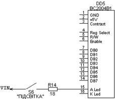 В проектованому пристрої живлення підсвітки здійснюється безпосередньо від блоку з 4 батарейок, загальна напруга Uживл яких становить 6 В. Тоді падіння напруги на обмежуючому резисторі UR14 складе