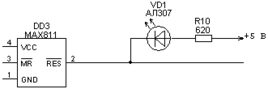 Для розрахунку обмежуючого резистора розглянемо фрагмент принципової схеми пристрою, на якому зображено супервізор DD6, світлодіод VD1 і резистор R10, що розраховується (рис. 3.1).