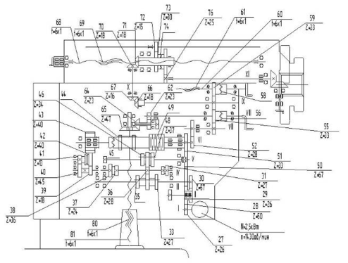От электродвигателя мощностью 2,5 кВт вращение передаётся через зубчатое колесо 27 и подвижный блок шестерён 28, находящимся на валу II на вал III, затем через 2 тройных блока шестерён – на вал VI. Посредством пары зубчатых колёс вращение передаётся на вал VII, а от него через зубчатые колёса на вал VIII, от которого через пару конических шестерён осуществляется вертикальное перемещение консоли при помощи ходового винта и гайки.