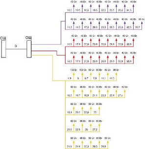 Далее составим расчетную схему, на которой покажем все осветительные щиты и группы, число проводов и длину групп, мощность источников света и места ответвления (рисунок 7).