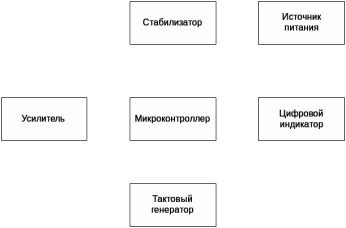 Импульсный сигнал поступает на усилитель входного сигнала, с коллектора которого идет на вход микроконтроллера. Для отображения информации применен цифровой индикатор со встроенным контроллером. Питание поступает на все составные части с источника питания - батареи "Крона" GB1 через стабилизатор.
