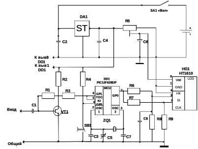Усилитель входного сигнала собран на транзисторе VT1, с коллектора которого импульсный сигнал поступает на вход T0CKI (вывод5), микроконтроллера DD1. Для отображения информации применен цифровой индикатор HT1610 (HG1) со встроенный контроллером. При работе в режиме ведомого вход НК индикатора HG1 соединяют с общим проводом, а данные передаются последовательно 4-битными посылками по линиям D1 и CLK. Ограниченное число линий ввода- вывода микроконтроллера DD1 не позволяет выделить две из них для реализации штатного режима передачи данных, поэтому данные и синхроимпульсы приходиться передавать с выхода GP0 микроконтроллера DD1 через резистивные делители. На вход CLK индикатора HG1 импульсы поступают через делитель R7R9, а на вход DI- через интегрирующий делитель R6R8C8. Для передачи низкого логического уровня (логического 0) на выходе GP0 микроконтроллера DD1 формируется импульс напряжения длительностью 5 мкс. При этом конденсатор С8 зарядиться не успевает, и по спаду импульса на входе DI в индикатор HG1 запишется логический 0. Для передачи логической 1 длительность импульса намного больше постоянной времени цепи R6R8C8, и конденсатор С8 успевает зарядиться до высокого логического уровня, поэтому будет записана логическая 1. Пауза между импульсами также должна быть более постоянной времени цепи R6R8C8, чтобы конденсатор С8 успел разрядиться.
