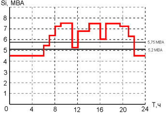 Для этого на графике (рис.1.3) проводим прямую, соответствующую максимуму суточной нагрузки, и которая будет являться максимальной нагрузкой для трансформатора. Так как перегрузка одного трансформатора в течении суток не должна превышать 30 на графике проводим линии, соответствующие мощностям одного трансформатора, увеличенным на 30%. Площадь, ограниченная двумя этими линиями будет равняться мощности недоотпущеной электроэнергии.